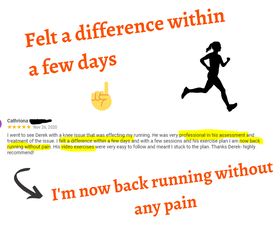 I went to see Derek with a knee issue that was affecting my running. He was very professional in his assessment and treatment of the issue. I felt a difference within a few days and with a few sessions and his exercise plan I am now back running without pain. His video exercises were very easy to follow and meant I stuck to the plan.